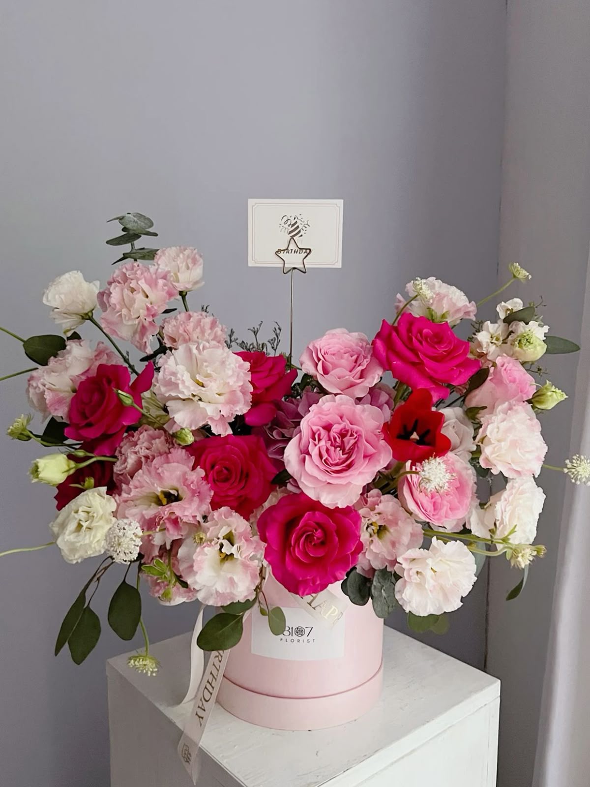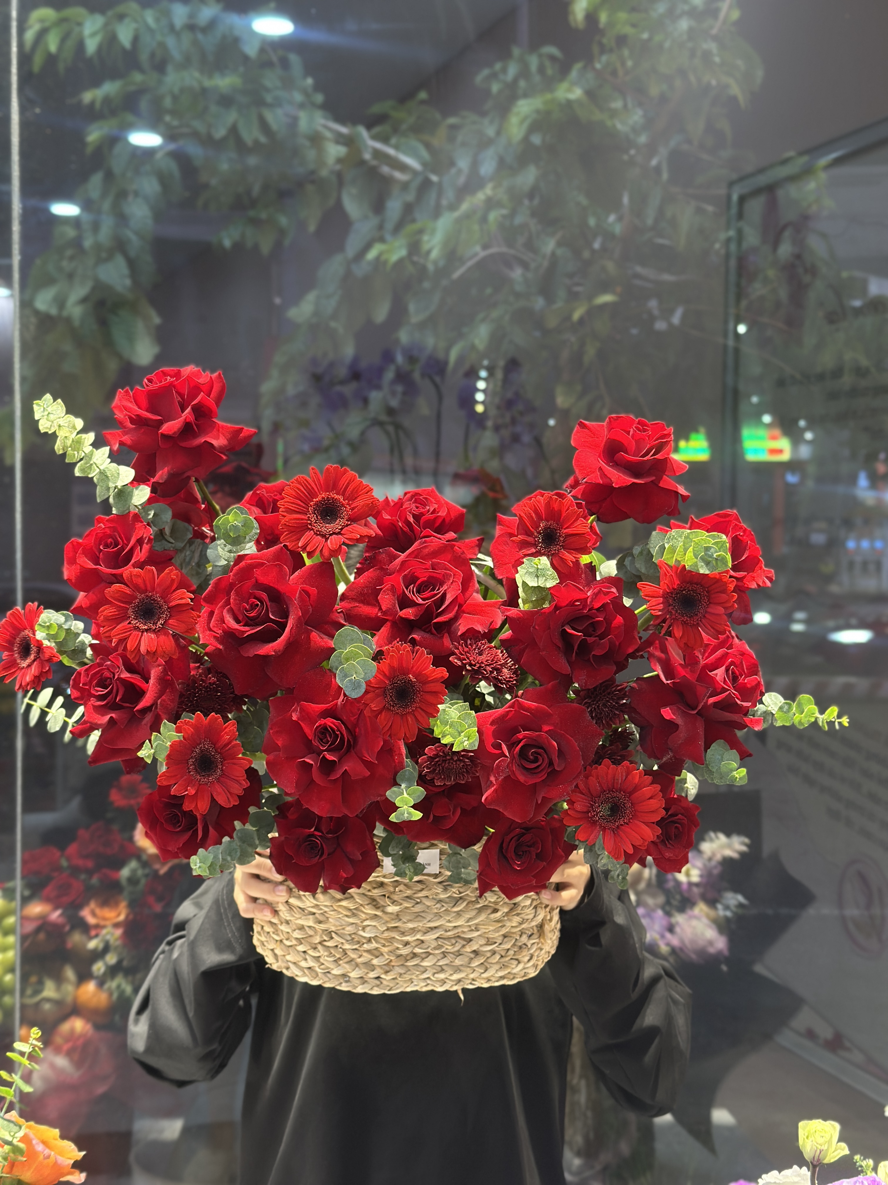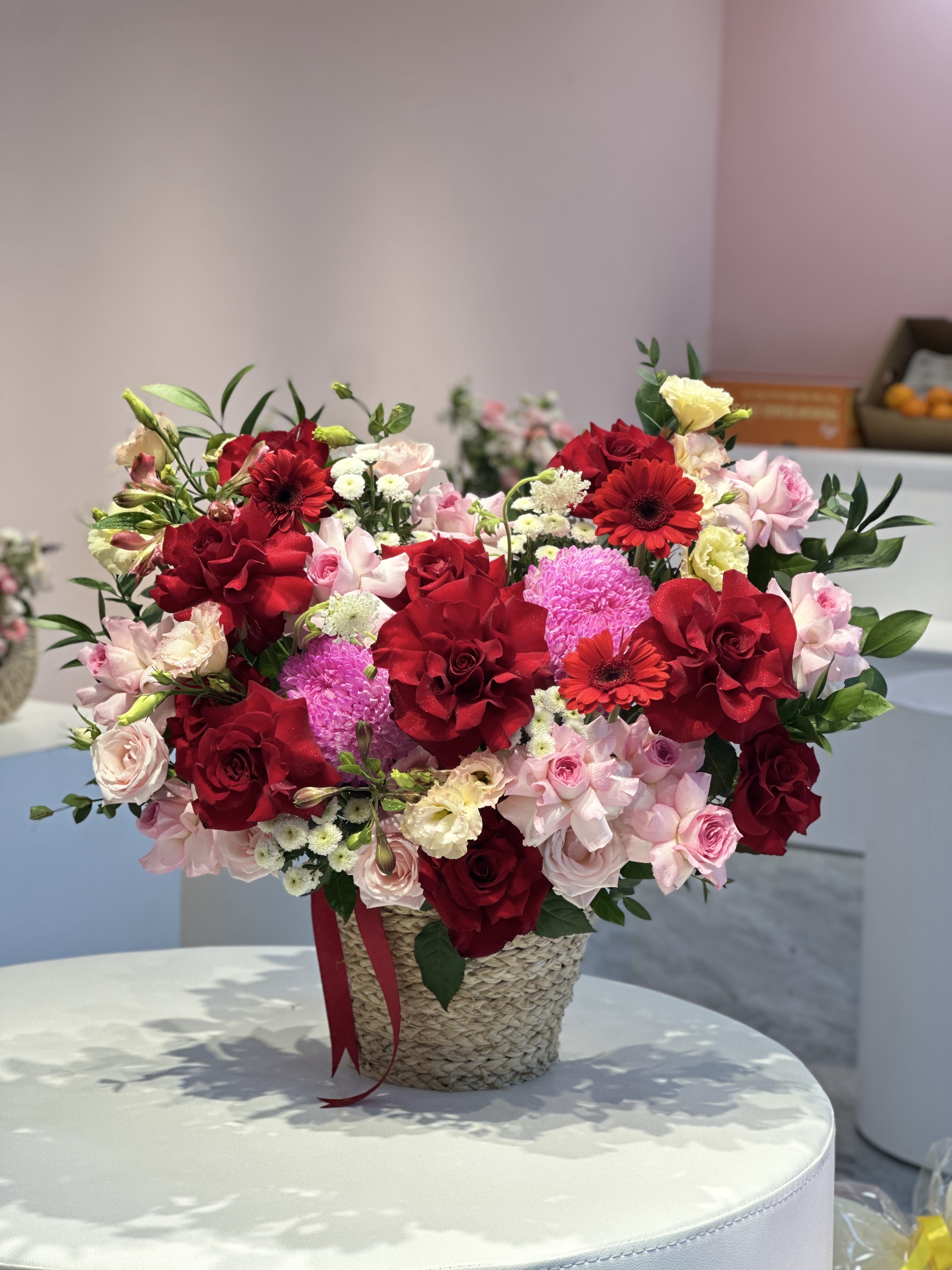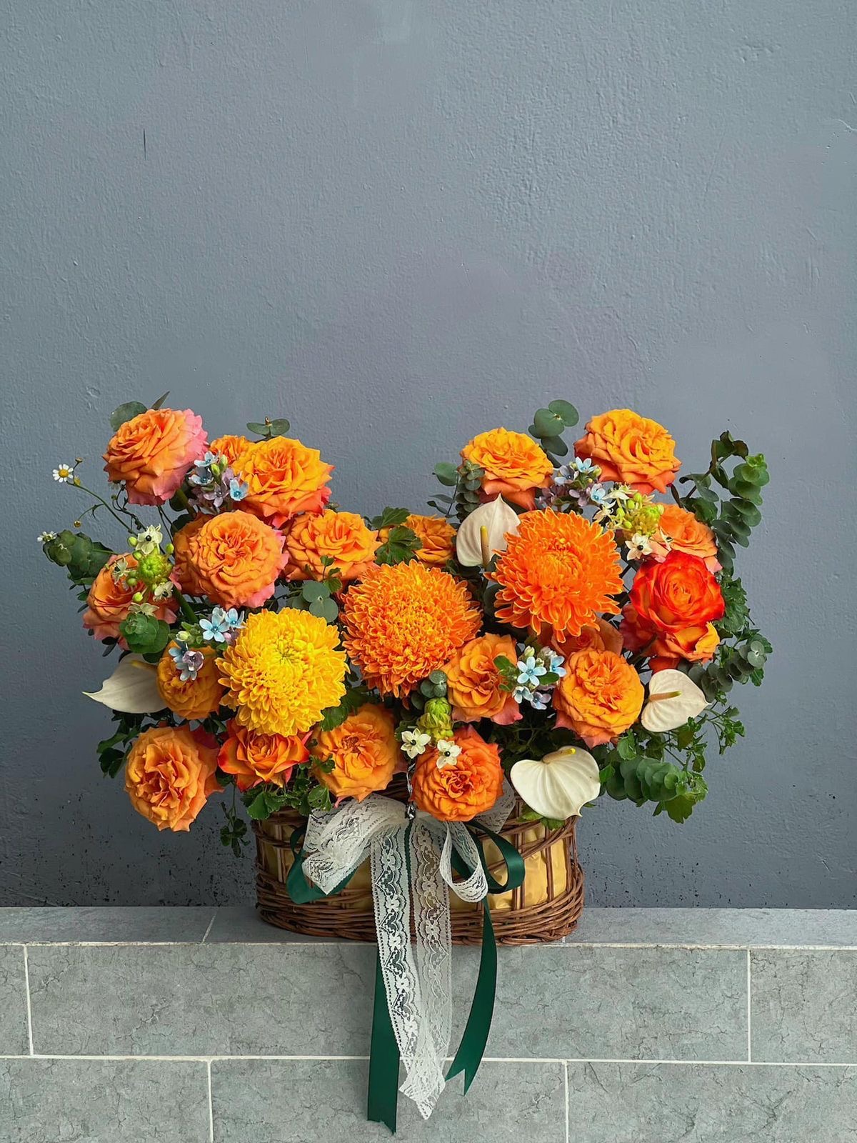 Mỗi giỏ hoa được phối kết tỉ mỉ, hòa quyện giữa sắc màu và bố cục để tạo nên một tổng thể hài hòa, mang đậm dấu ấn của sự tinh tế.