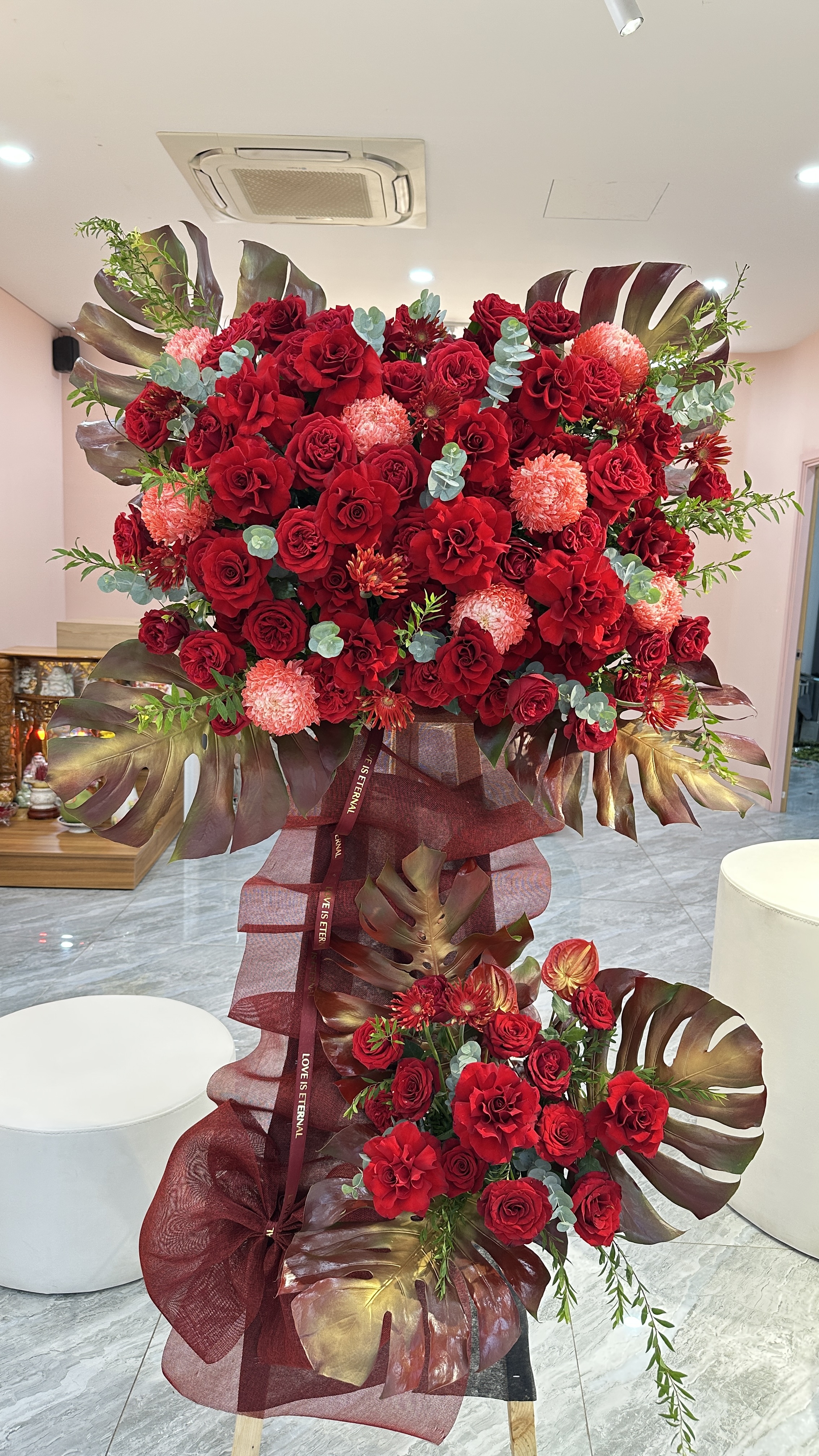 Mỗi kệ hoa được thiết kế tỉ mỉ với bố cục vững vàng, phối sắc hài hòa, mang thông điệp chúc mừng hân hoan và đầy khí thế.
